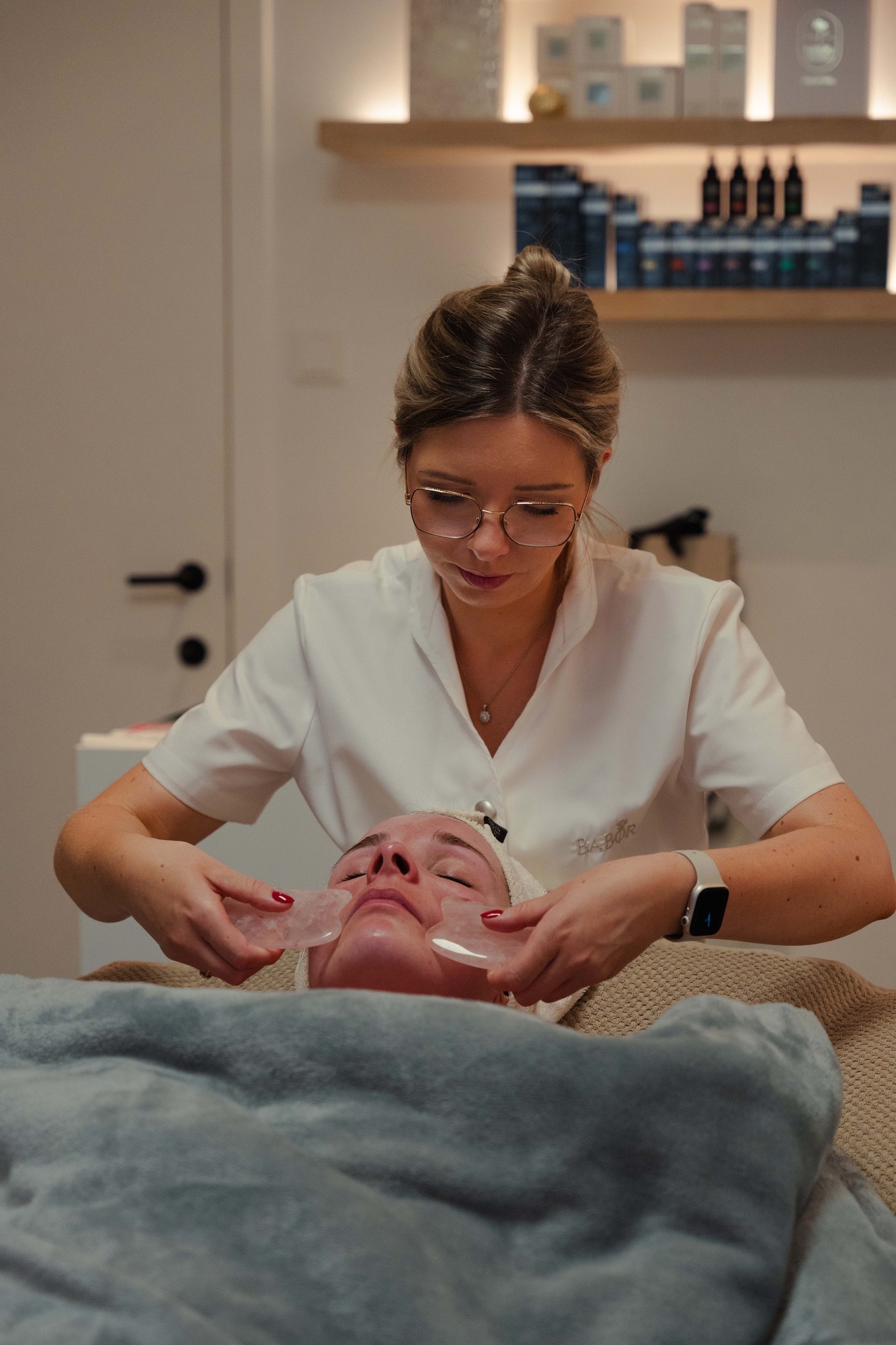 Reiniging | doorbloedingsmasker | diepwerkende peeling | arm-hand scrub | werkstoffenserum | oog- en lippen behandeling bolle lepeltjes | lifting massage | speciaal masker | handmassage | individuele afsluitende verzorging
