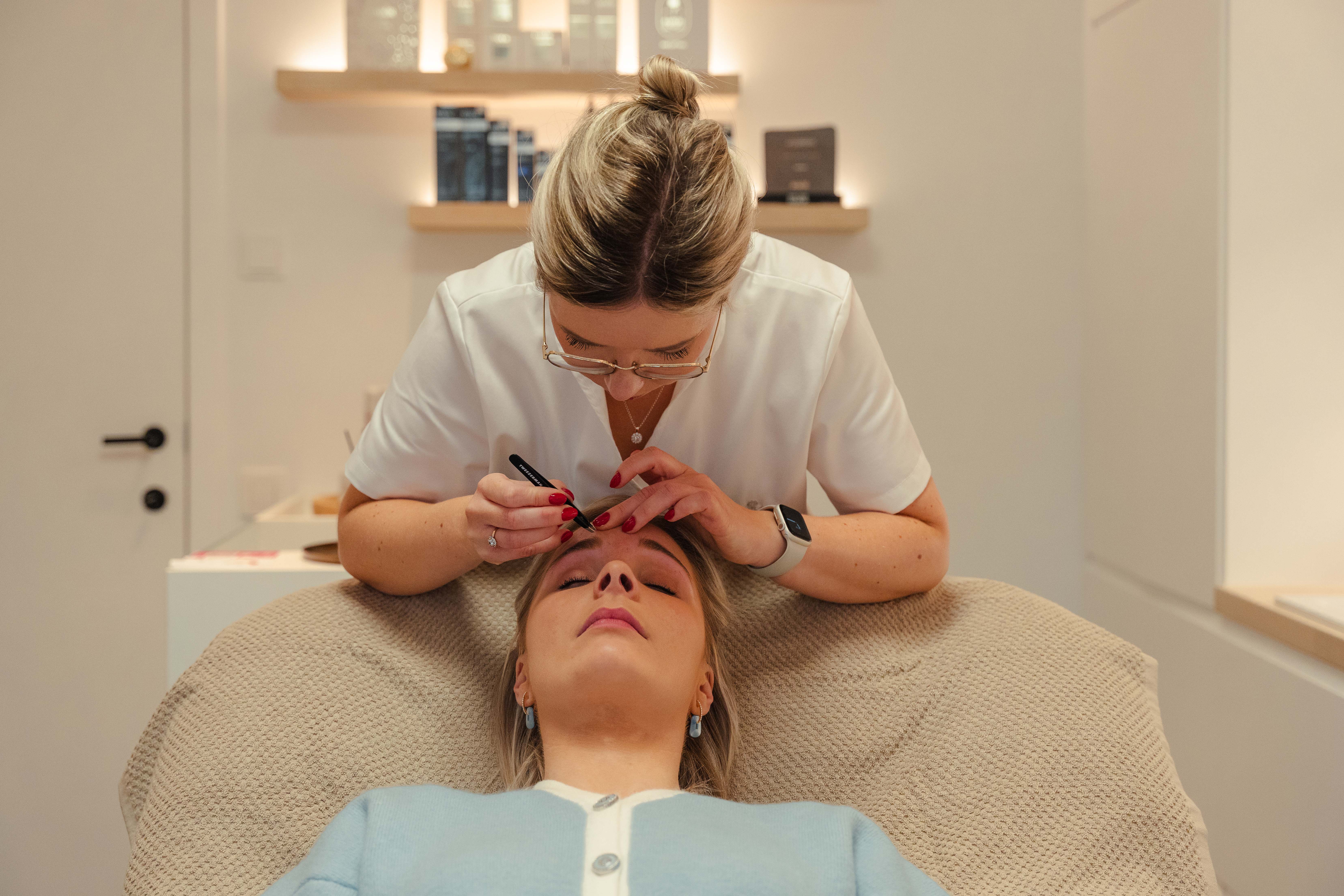 Epilatie wenkbrauwen en de wenkbrauwen bijtekenen met wenkbrauwpotlood.